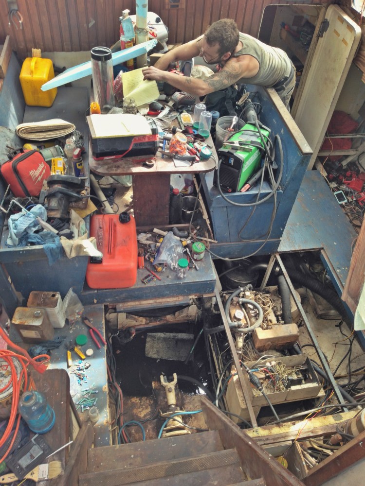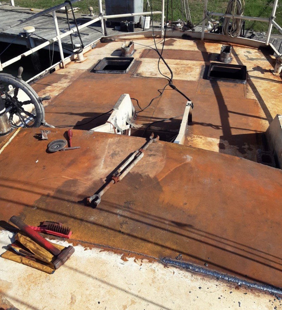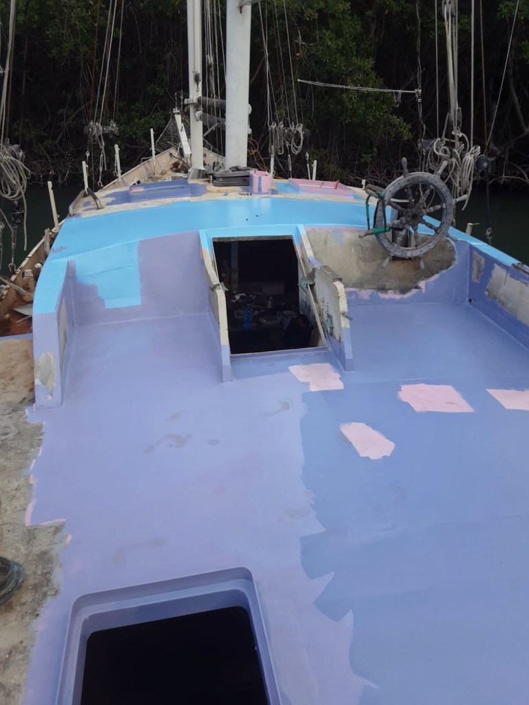 Once We were in Luperon with both boats and all the tools in one place, there was nothing to do but get started. One of our highest priorities was to stop rainwater from coming in, and to stop the boat from filling with water. For the first wave of welding we worked with Luperon’s most famous welder- Felo, who can be found most days at his shop a block up from the municipal dock. Because we still did not have electricity sufficient to run welders on the boat or on the dock, Felo was able to bring over a generator welder and he, his crew, and we, cut out half the cabin roof and most of the back deck to replace them with new material. We canceled two of the hatches on the cabin roof and replaced the two on the back deck with more moderately sized ones, farther from the high-traffic cockpit area. We prepped the new steel with an anodic primer, and four coats of high-build epoxy barrier-coat. We used drops of pigment in each coat of epoxy paint to help keep track of how many complete coats there were, and I must say, the effect is pretty.