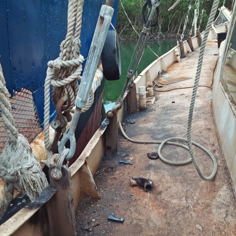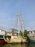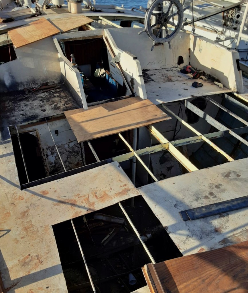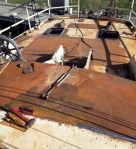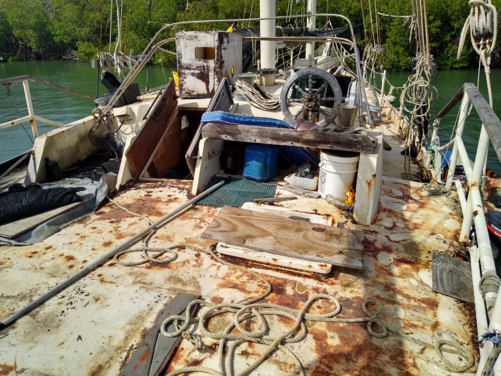 We were offered a 17 meter, 25-ton, gaff-rigged, steel schooner. The schooner is sitting in the Dominican Republic where it has been for 10 years without any maintenance. 14 years ago when we were first salvaging Drummer in south Florida, an ambitious family was outfitting this schooner in the same boatyard for a world voyage that never happened. The boat is large, with 8+ full size berths, and good potential for shop and common spaces. She still has her spars, sails, and engine, the hull is in alright condition above and below the waterline. However, the steel deck was full of holes and there was water damage in the interior.